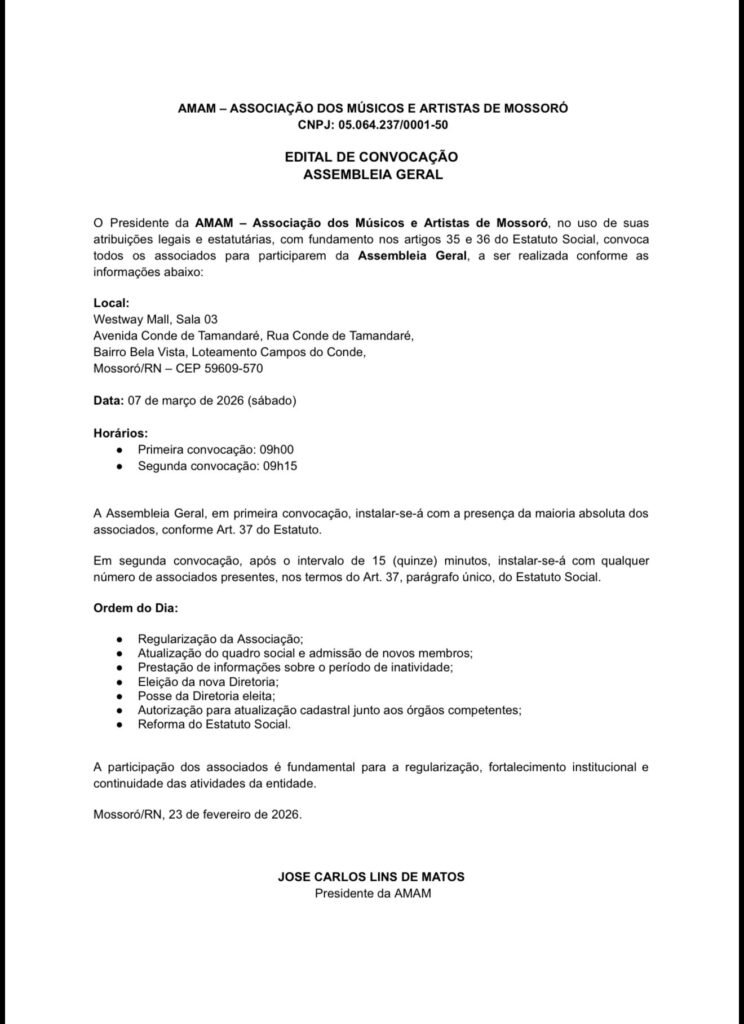 A Associação dos Músicos e Artistas de Mossoró (AMAM) publicou edital de convocação convidando todos os associados a participarem da Assembleia Geral da entidade, que será realizada no próximo dia 7 de março de 2026 (sábado), em Mossoró. A reunião acontecerá no Westway Mall, Sala 03, localizado na Avenida Conde