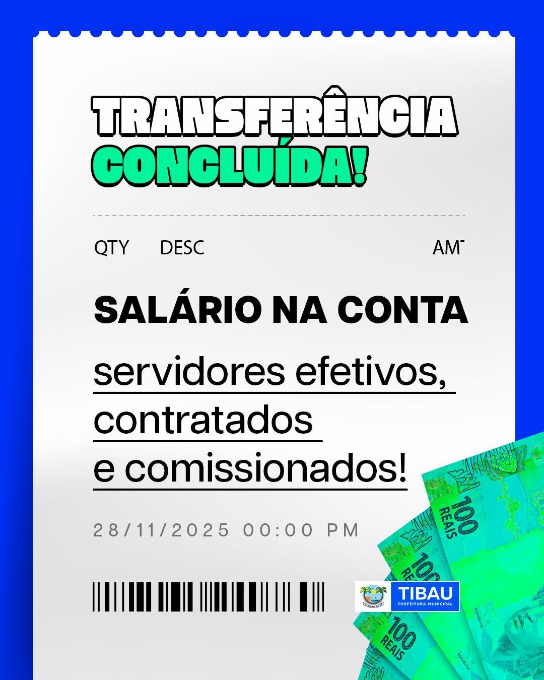 Prefeitura de Tibau realizou nesta sexta-feira, 28 de novembro, o pagamento antecipado dos salários dos servidores municipais. A medida reforça o compromisso da gestão em manter os vencimentos em dia.
